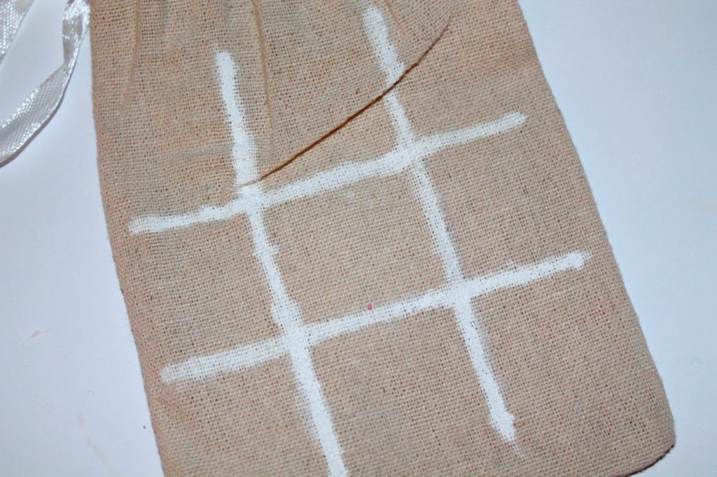 Auf der Rückseite von dem kleinen Säckchen habe ich mit meinem Edding mit Hilfe eines Lineals das Spielfeld aufgemalt.