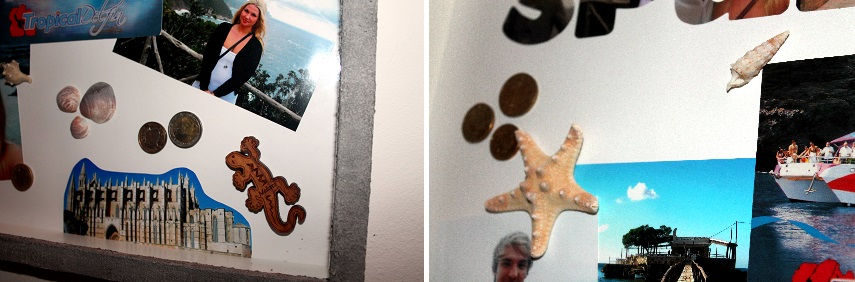 Danach habe ich aus Bilder in einem Bildbearbeitungsprogramm Bilder in Buchstaben umgewandelt. Diese habe ich dann im Copy Shop ausdrucken lassen und ausgeschnitten. Die Buchstaben habe ich dann auf die weiße Pappe geklebt. Ich habe erst alle Fotos, Flugtickets etc. auf die Pappe gelegt und anschließend mit Klebstoff und Heißklebepistole festgeklebt. Hierbei ist eure Kreativität gefragt.
