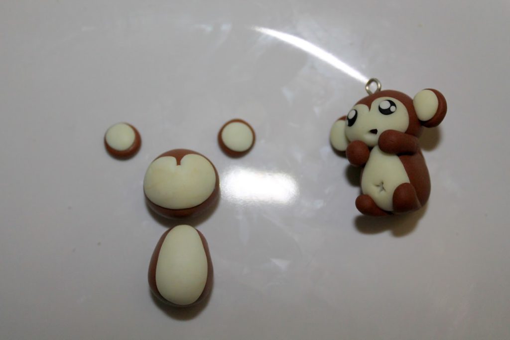 Nun nehmt ihr alle Teile und setzt sie zusammen. Wichtig dabei ist alles ein wenig fest zu drucken, damit nichts abfällt. Ich nehme dazu einfach ein Messerspitze. Die kleinen Augen habe ich auch mit Fimo gemacht. Dazu einfach wieder zwei kleine, schwarze Kugeln formen und festdrücken. Dann 4 kleine weiße Kugeln auf dem schwarzen Fimo festdrücken. Am Ende ritze ich noch einen kleinen Bauchnabel und einen Mund ein und fertig sind eure kleinen Fimo Affen.