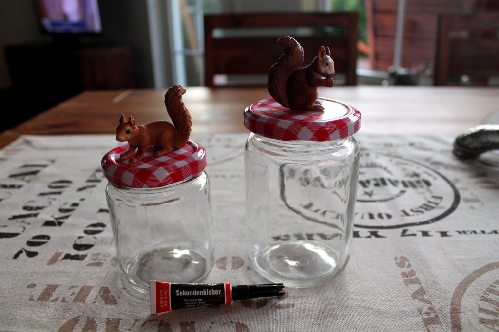 Als erstes hab ich meine Figuren mit Sekundenkleber auf die Deckel geklebt. Diese gut trocknen lassen. Zieht am besten Handschuhe an, wenn ihr so trottelig seid wie ich. Das ist nicht das erste Mal, dass ich mir die Finger zusammen klebe. Man sollte ja meinen, dass man aus Fehlern lernt.