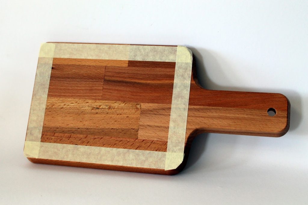 Als erstes klebt ihr euer Holzbrett ab. Ich habe dazu ganz einfaches Abklebeband genommen. Drückt das Abklebeband richtig am Holzbrett fest damit nichts unterläuft.