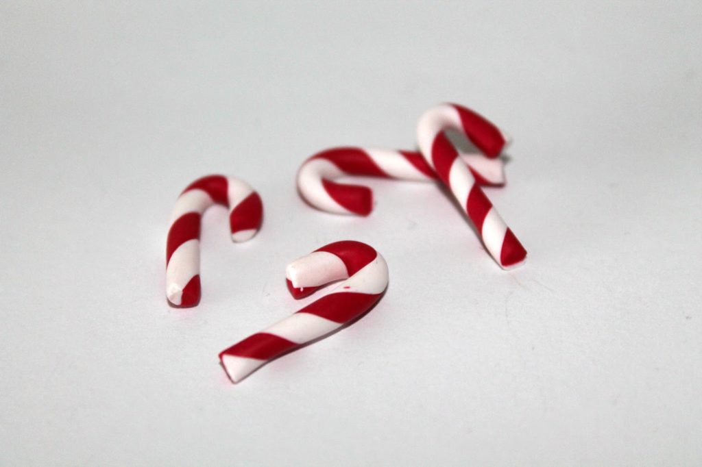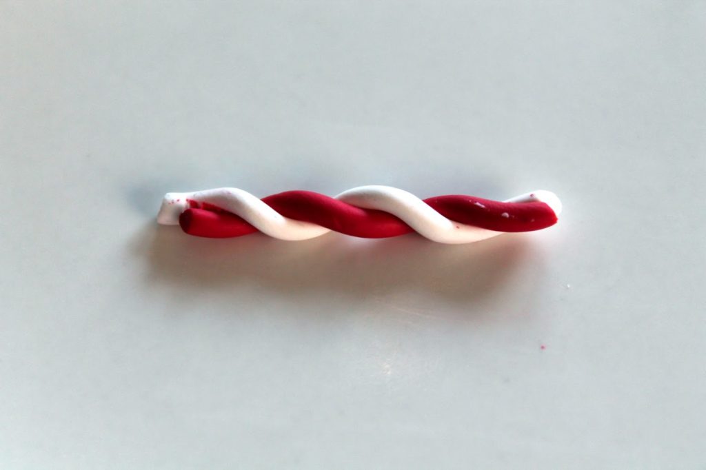 Dazu braucht ihr weißes und rotes Fimo. Als erstes formt ihr 2 Würste und legt sie wie auf dem Bild unten zusammen, danach dreht ihr sie ein wenig ein und rollt sie nochmal. Nun nur noch zurecht schneiden und in Form bringen.