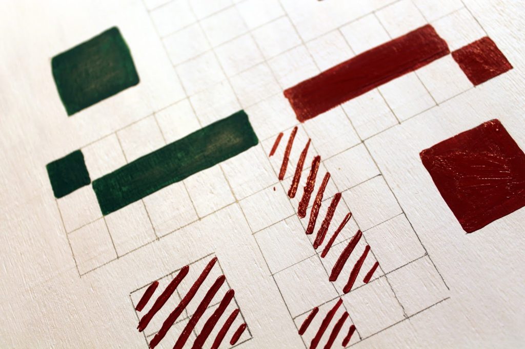 Danach habe ich das Spielfeld aufgemalt. Dazu habe ich einfach das Gitter mit einem Bleistift und einem Geodreieck auf das Holz übertragen.