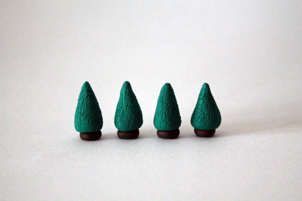Dazu formt ihr einen Kegel und schlitzt ihn mit dem Messer ein wenig ein, so dass es wie Tannenzweige aussieht. Danach macht ihr mit braunem Fimo eine Kugel und drückt sie platt und drückt sie vorsichtig ans grüne Fimo.