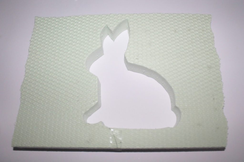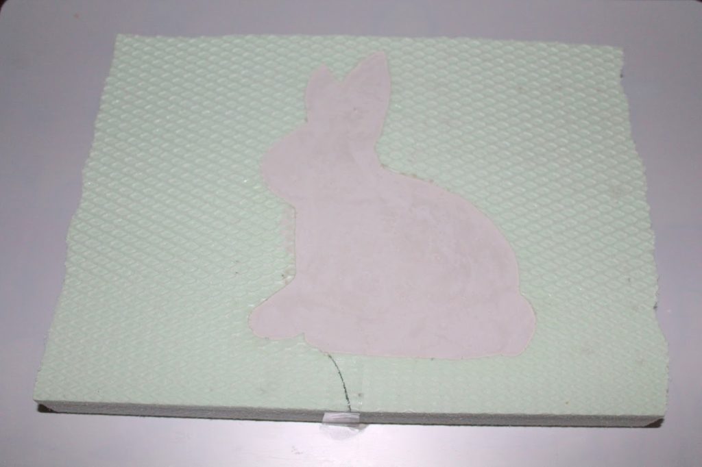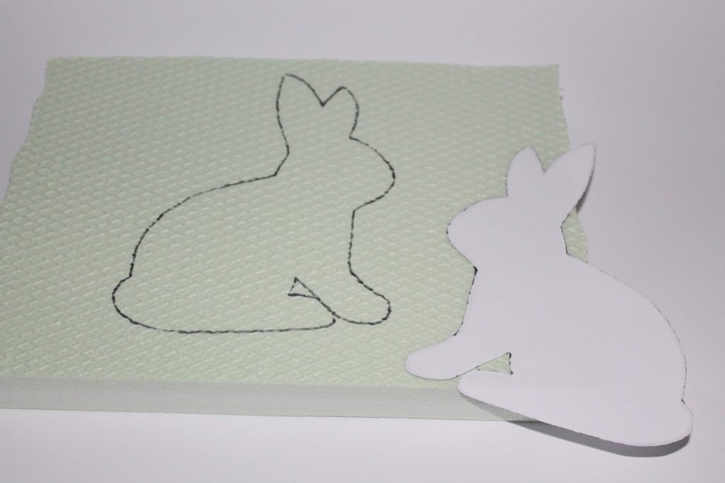 Nachdem ich die Platte in kleinere Stücke zerteilt habe, habe ich mein Hasenmotiv auf die Platte gezeichnet. Dazu habe ich mir einen Hasenvorlage ausgedruckt, ausgeschnitten und mit einem Edding auf die Styrodurplatte übertragen.