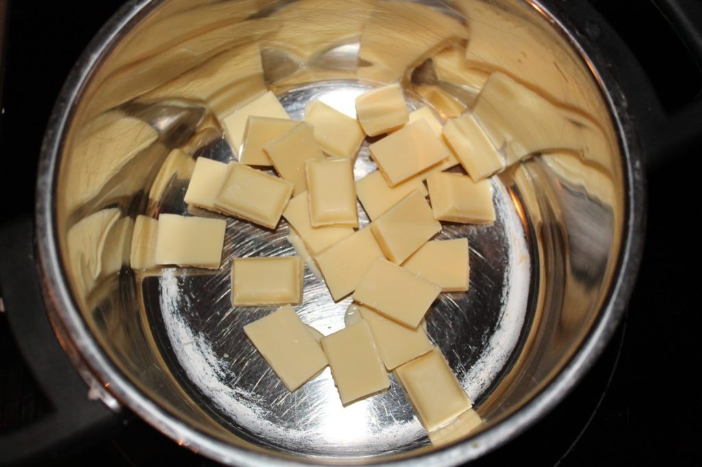 Danach habe ich die weiße Schokolade geschmolzen. Ich habe 2 Varianten ausprobiert.