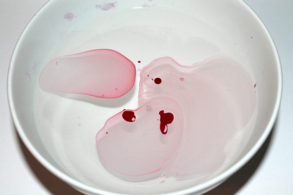 Als Erstes braucht ihr eine Schale mit lauwarmen Wasser. Da tröpfelt ihr dann etwas Nagellack rein. Ich habe mich für zwei verschiedene Farben entschieden. Einen roséfarbenen Ton und ein dunkles Rot.