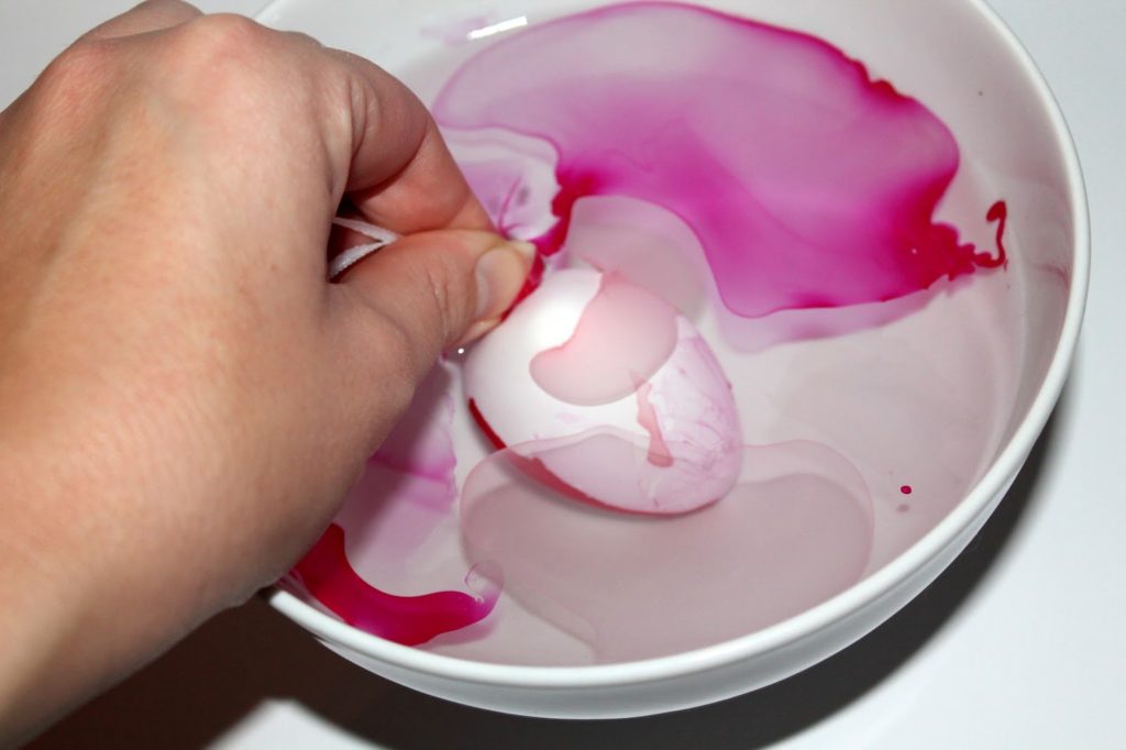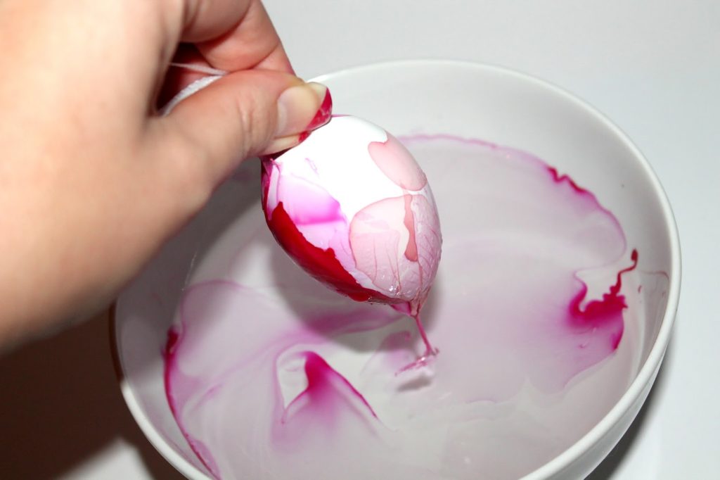 Tunkt das Ei komplett ein. Wenn Euch die Färbung noch nicht ausreicht, tunkt es gleich ein 2. Mal ein. Ihr müsst euch ein wenig beeilen, weil der Nagellack schnell eine Kruste auf dem Wasser bildet. Ich habe auch nach jedem Ei wieder eine neue Mischung angesetzt.