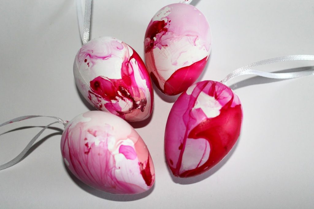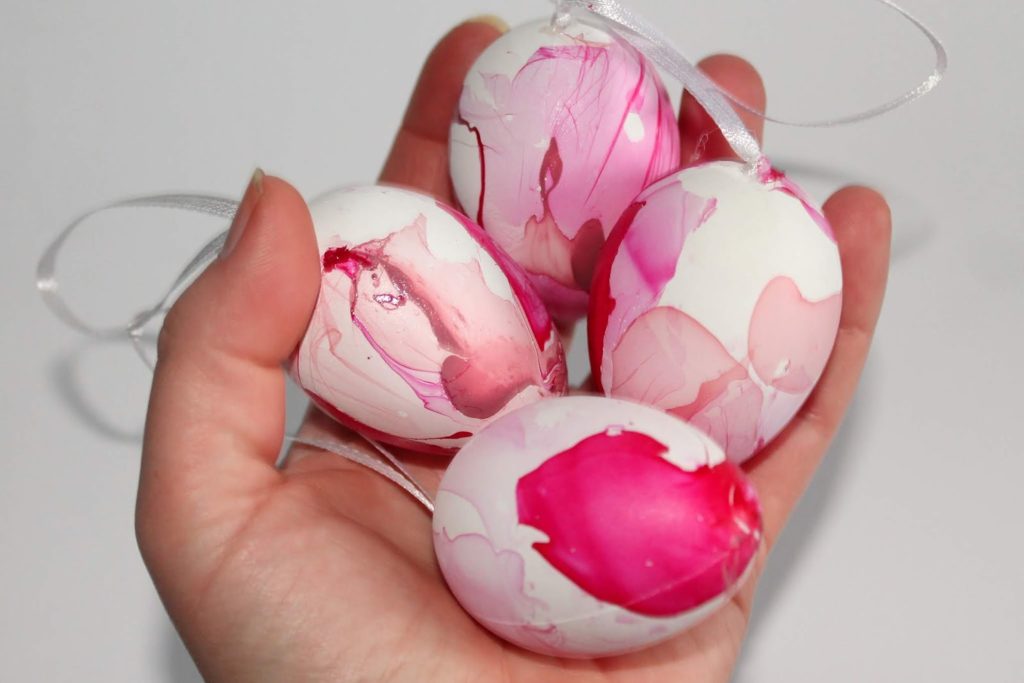 Verteilt nun euren Nagellack etwas mit einem Zahnstocher und tunkt euer Osterei ein.