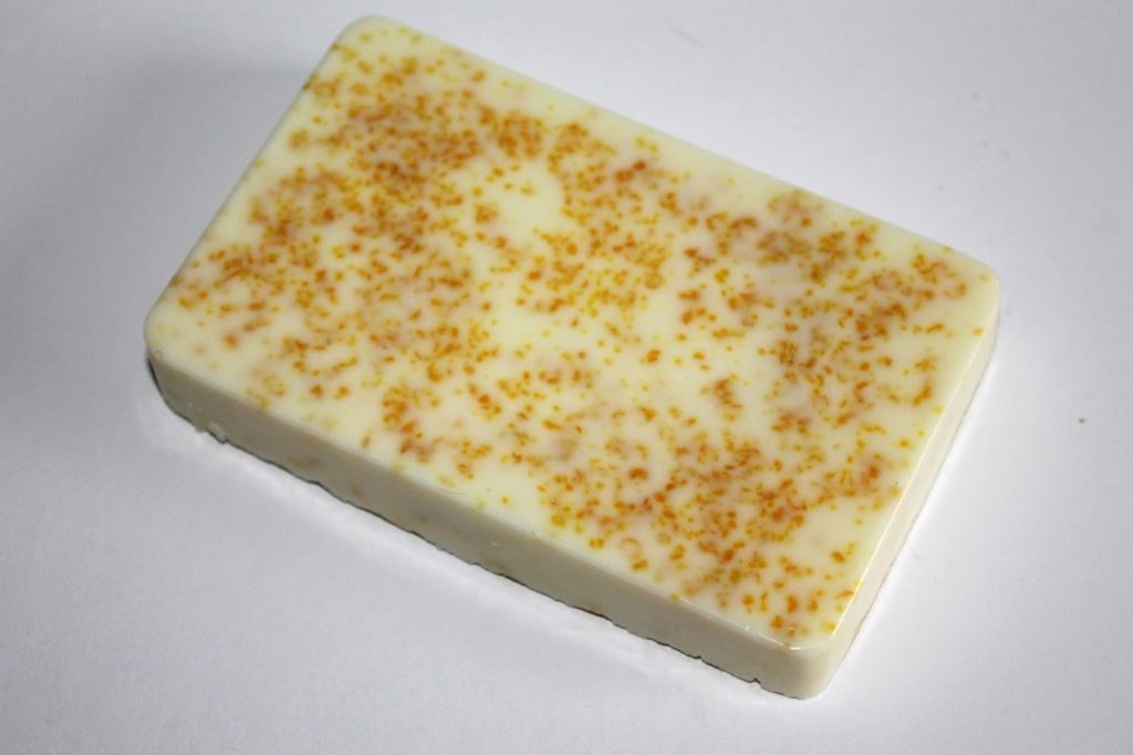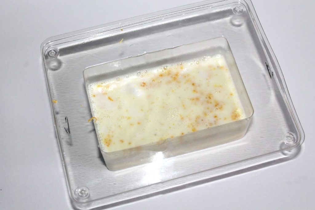 Als erstes habe ich die Seifenrohmasse geschmolzen. Dieses könnt ihr zum Beispiel in einem Wasserbad machen. Dabei sollte das Wasser nicht kochen und eine Gradzahl von 60 nicht übersteigen. Man kann sie aber auch in der Mikrowelle schmelzen. Passt dabei nur gut auf und nicht dabei weggehen. Das gilt natürlich auch für das Schmelzen im Topf. 🙂