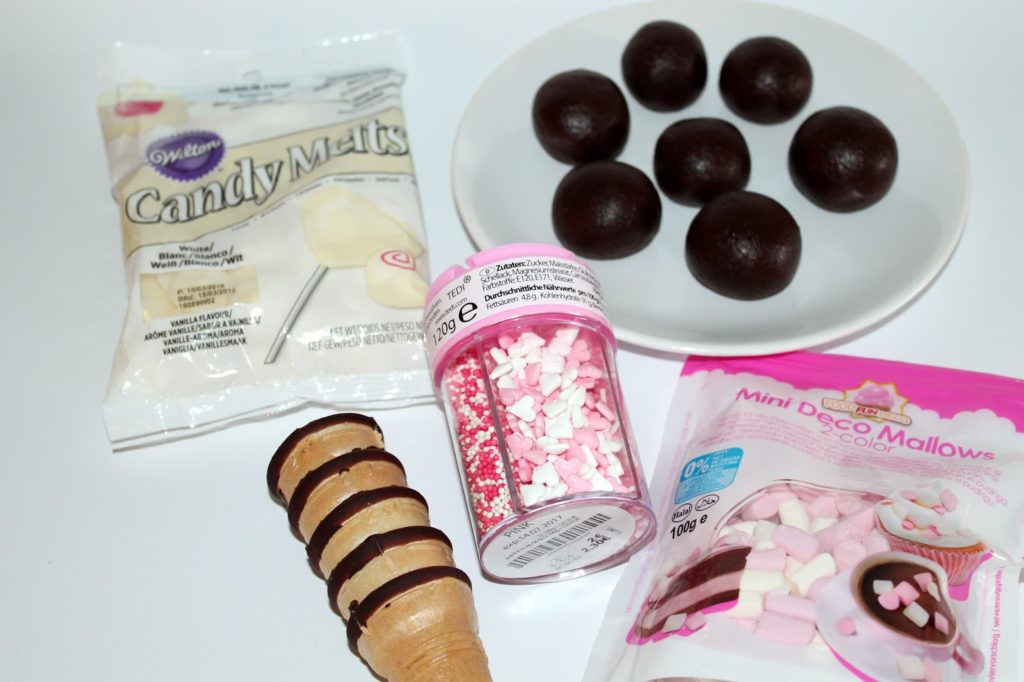 Dann habe ich als erstes die Eistüten eingetunkt und danach die Cake-Pop Kugeln.