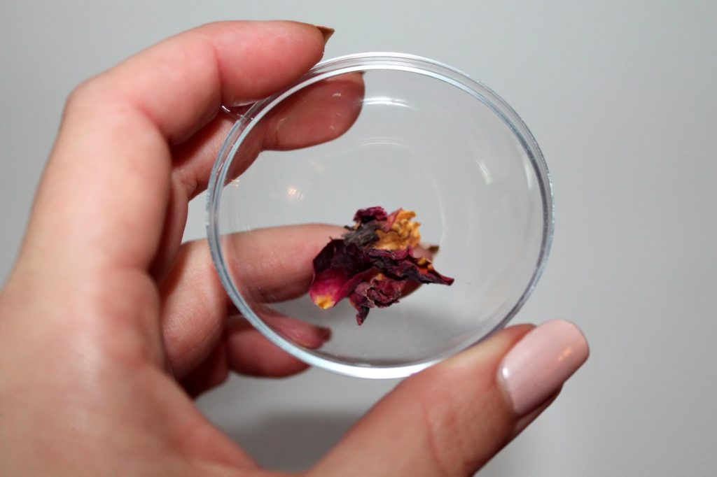 Ich habe dann ein paar Rosenblüten in die Acrylkugel gegeben.