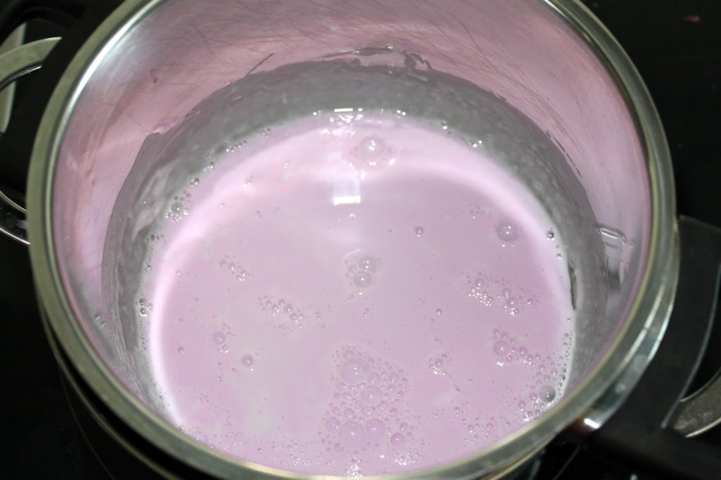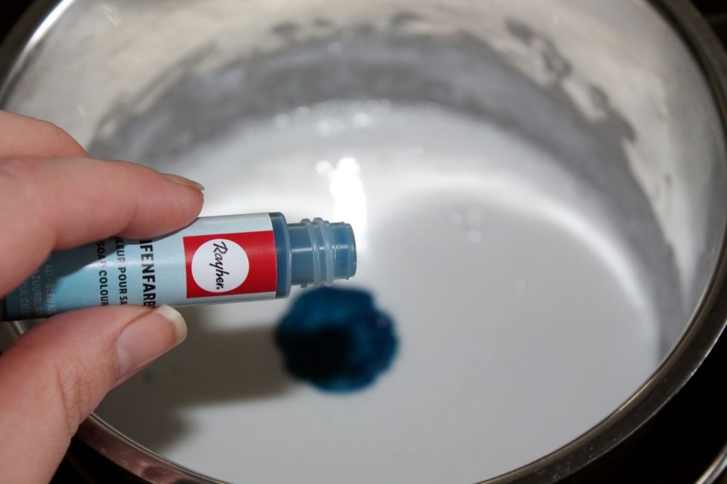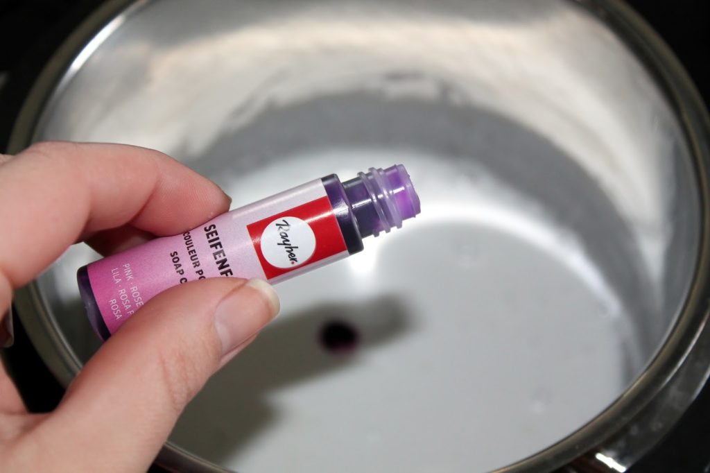 Danach habe ich die pinke Seifenfarbe hinzugefügt. Dafür habe ich nur einen Tropfen verwendet damit es rosa wird.