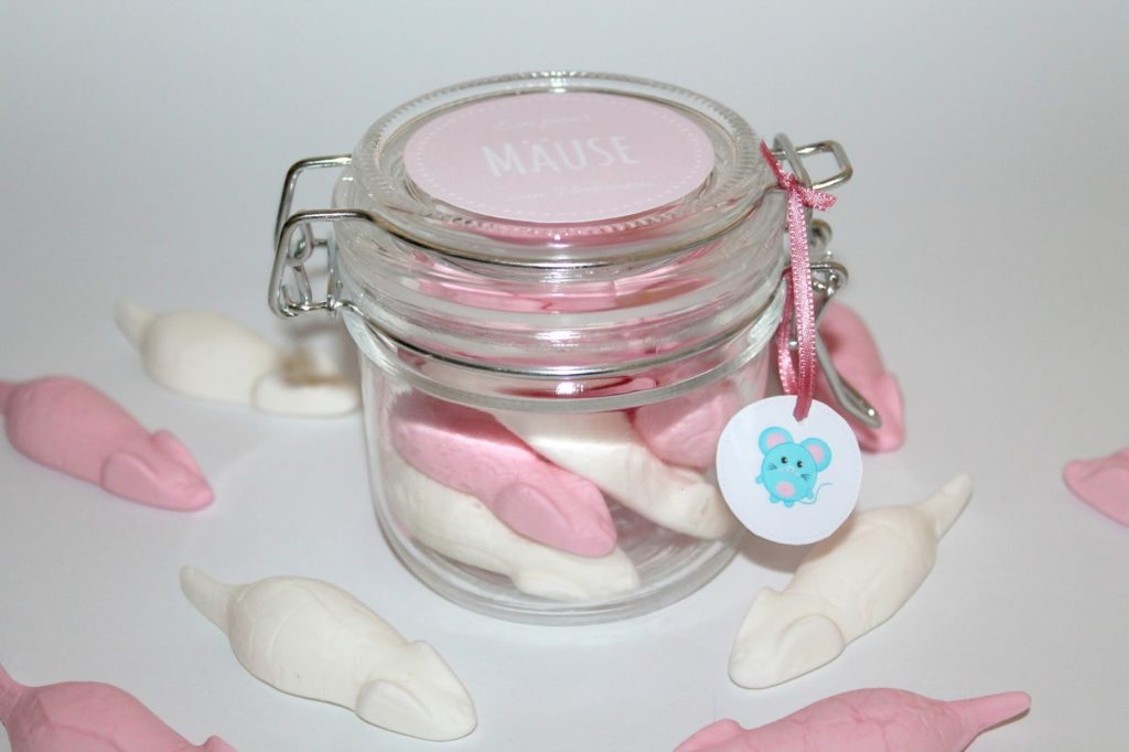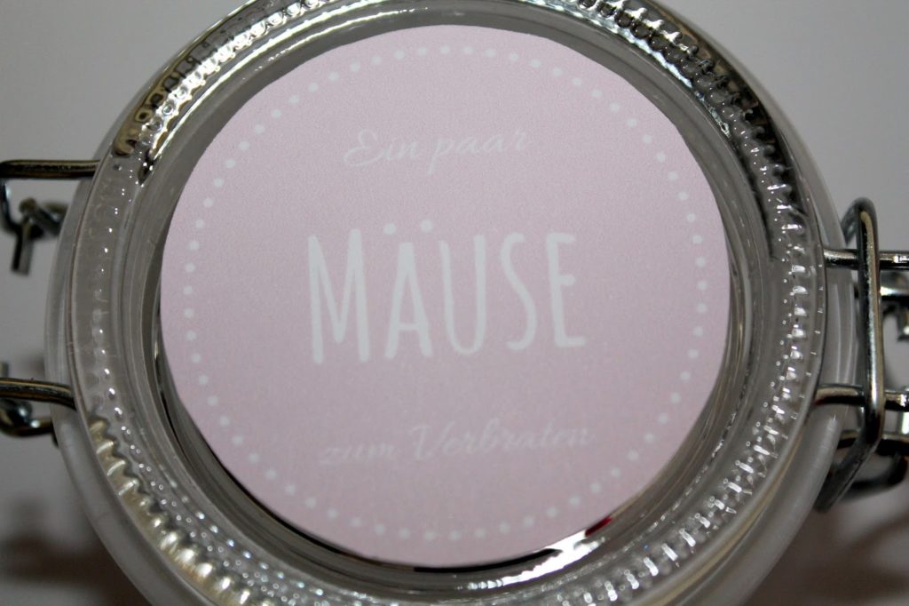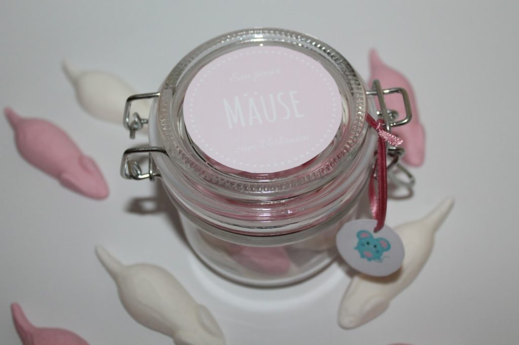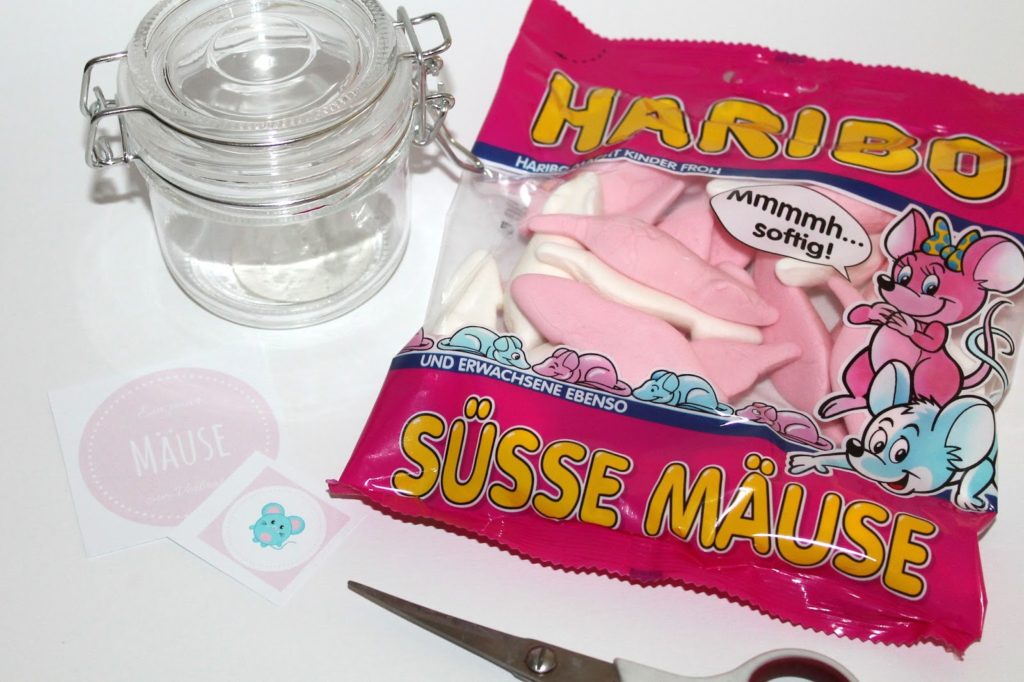 Das Schöne an dieser Bastelidee ist, das man dafür nur ein Einmachglas, ein paar Gummimäuse und ein Etikett braucht. Aber für das Etikett habe ich ja schon gesorgt. 🙂 Ich habe mein Glas meiner Tante zum 50 Geburtstag geschenkt. Allgemein verschenke ich sehr gerne Sachen im Glas, denn ein Glas hat man meistens zu Hause und irgendwas zum befüllen findet man auch immer.