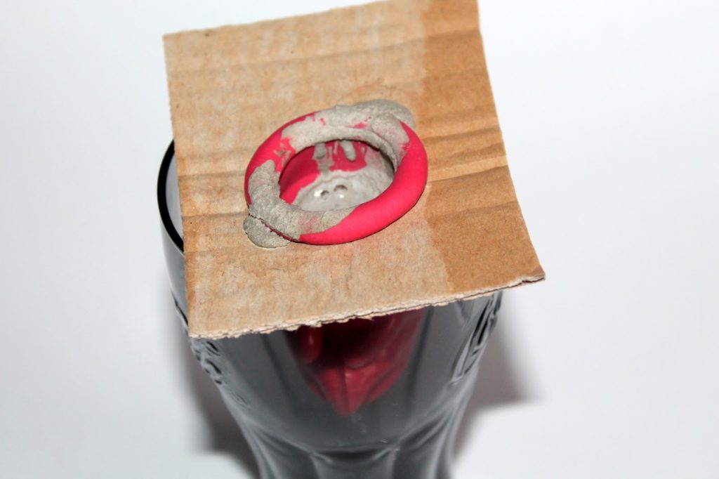 Da man diese Silikonform nicht einfach hinstellen kann, brauchte ich ein Gefäß wo ich sie reinhängen kann. Dazu habe ich erst in ein Stück Pappe ein Loch geschnitten und die Silikonform reingehängt. So konnte ich das Ganze dann in ein Glas hängen.