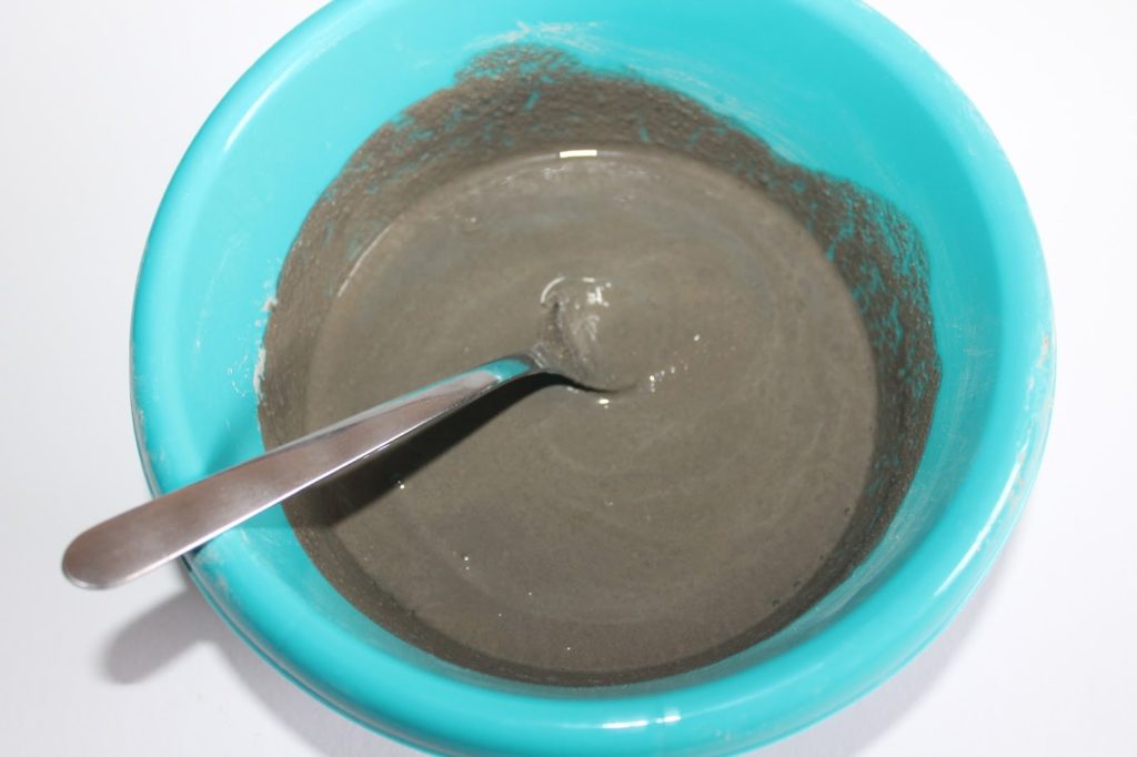 Als erstes habe ich ein wenig von meinem Beton in eine Schale gegeben und ein paar Tropfen Wasser hinzugefügt. Dies rührt ihr dann solange durch bis eine gleichmäßige, nicht zu feste, aber auch nicht flüssige Masse entsteht.