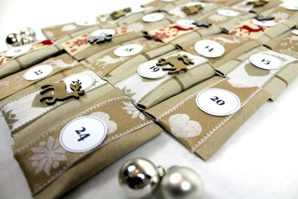 Als ich alle fertig hatte, habe ich noch Adventskalenderzahlen auf die fertigen Verpackungen geklebt. Diese habe ich ebenfalls mit doppelseitigem Klebeband befestigt.