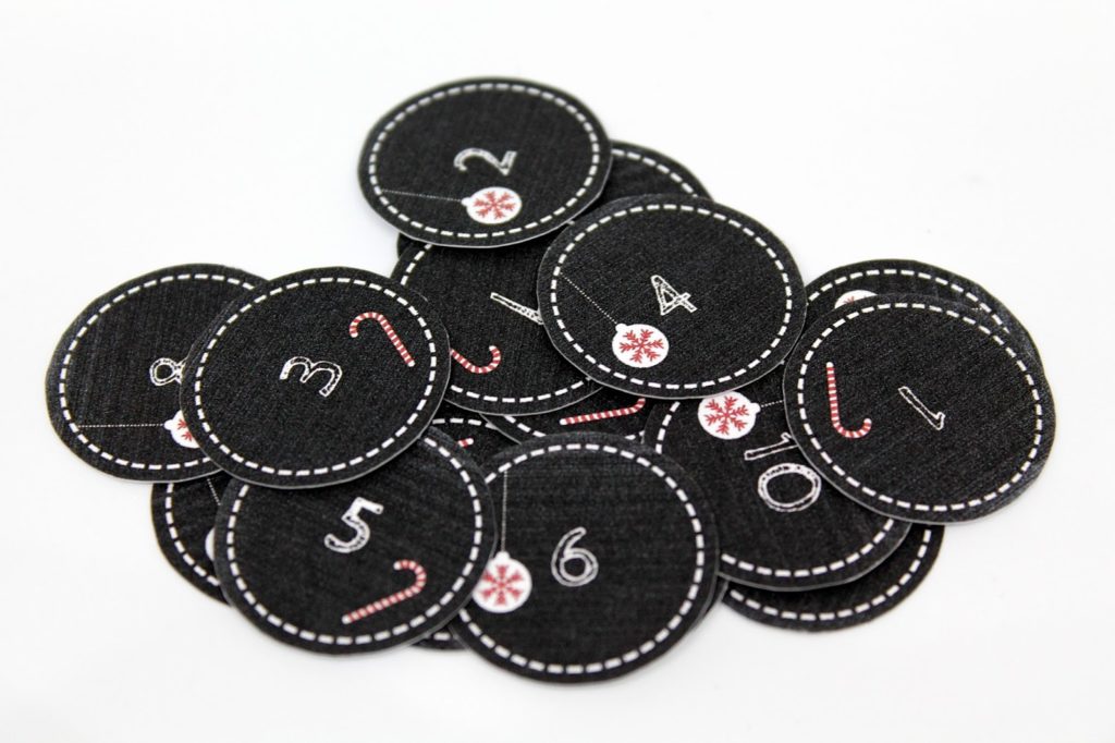 Dann habe ich auf allen 24 Etiketten ein kleines Stück doppelseitiges Klebeband befestigt und diese dann auf die Kronkorken geklebt.