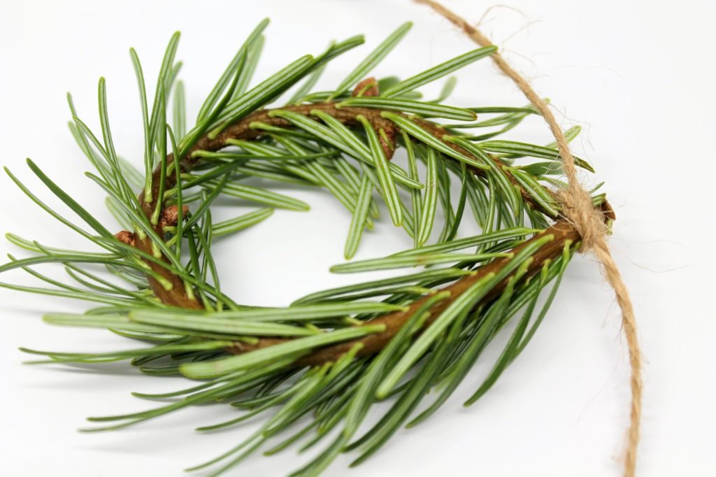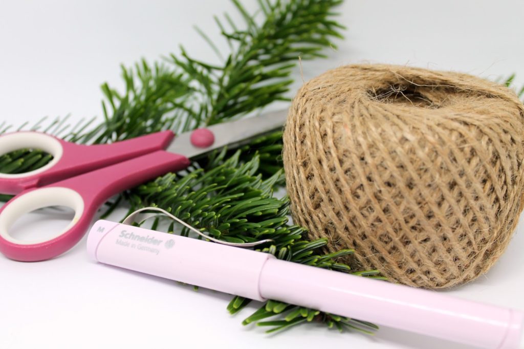 Ich habe mir einen der Tannenzweige genommen und ihn zu einem Kreis geformt. Je nachdem wie groß euer Kreis werden soll, umso kürzer oder länger schneidet ihr den Tannenzweig.