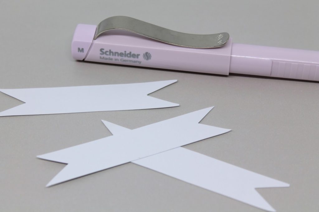 Als nächstes habe ich mit meinem Füller die Schilder beschriftet. Ich finde den Schneider Base Rosé klasse. Das liegt daran, dass ich Linkshänder bin und nie irgendwie einen Füller gefunden habe mit dem ich gut schreiben konnte. Ihr hättet mal meine Arbeiten aus der Schule sehen sollen, die Schrift, fürchterlich, meine Hände immer blau, so wie das komplette Blatt. Aber ich glaube die Linkshänder kennen dieses Problem. Außerdem ist der Füller rosa. Da bin ich typisch Mädchen. Zum Beschriften habe ich schwarze Tinte verwendet, da ich diese einfach lieber als die blaue mag.