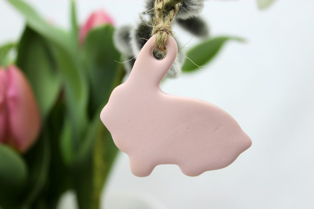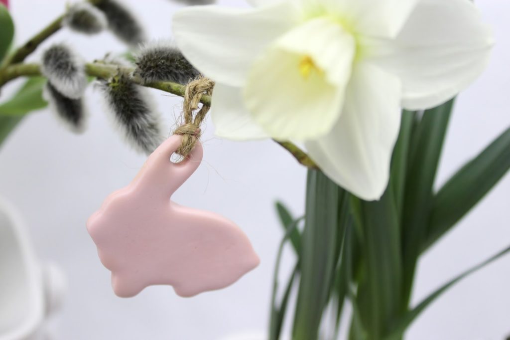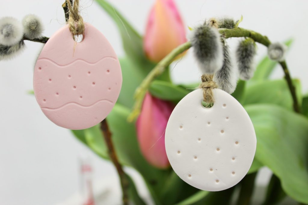 Als Erstes habe ich meine kleinen Osteranhänger aus Fimo gemacht. Ich habe mich für die Farben rosa und weiß entschieden, denn sie passen für mich einfach zum Frühling.