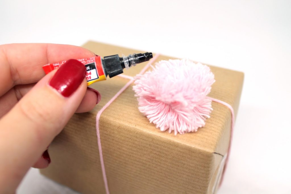 Zuletzt klebt ihr die Pompons mit Sekundenkleber an das Geschenk. Dann ist eure selbstgemachte Geschenkverpackung auch schon fertig.