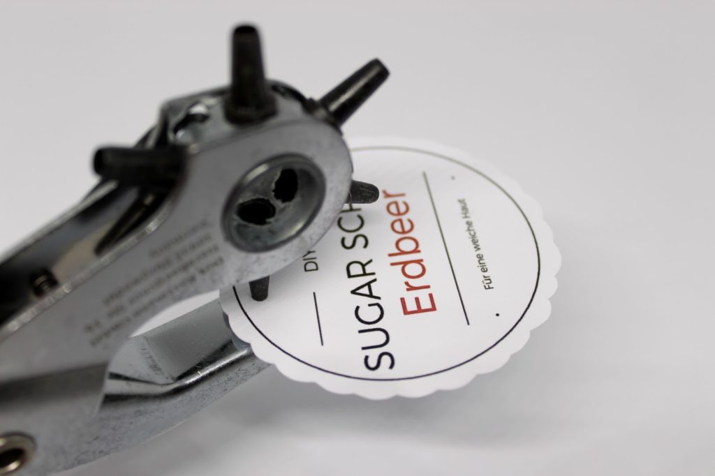 Schneidet nun die Vorlage aus und macht mit einer Lochzange zwei Löcher in das Etikett.