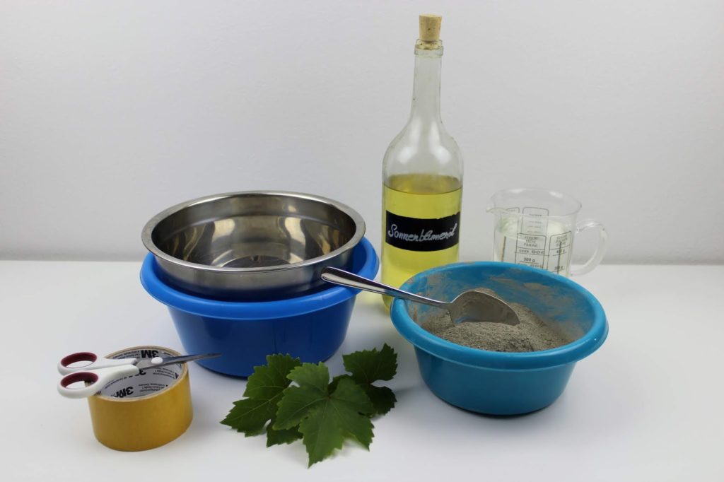 Nun bereiten wir die andere Schüssel vor. Nehmt dazu ein bisschen Sonnenblumenöl und verteilt es mit einem Stück Küchenrolle in der Schüssel. Diese Schüssel sollte größer sein, als die, wo ihr das Blatt draufgeklebt habt.