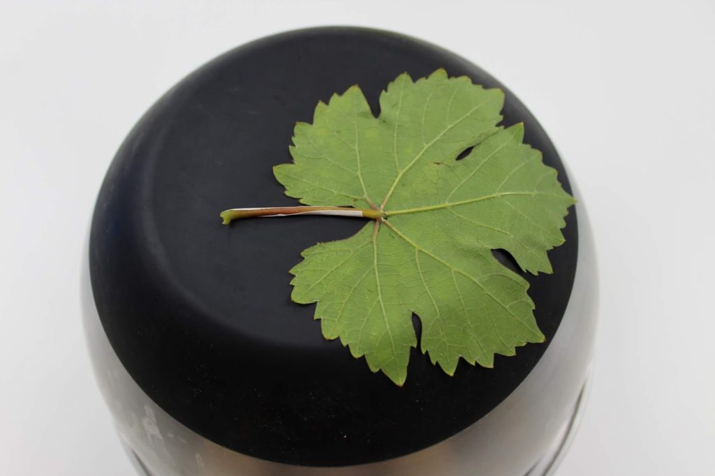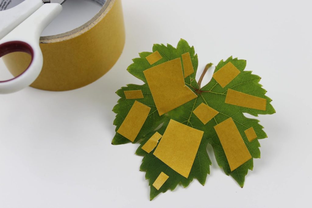 Bereitet zuerst euer Blatt vor. Klebt dazu auf die glatte Seite des Blattes doppelseitiges Klebeband. Warum auf die glatte Seite? Die andere Seite hat mehr Feinheiten und Strukturen des Blattes und diese wollen wir später in die Betonmasse drücken. Ich habe dazu ein Weinblatt verwendet.