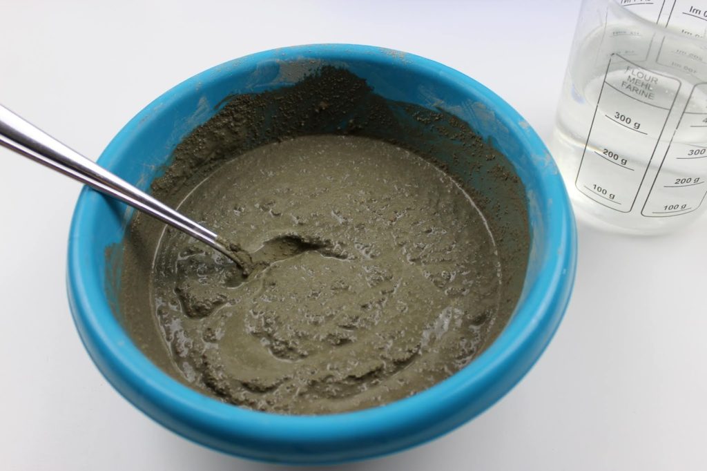In der letzten Schüssel rührt ihr euren Beton an. Füllt dazu etwas Beton in die Schüssel und gebt unter rühren Wasser hinzu. Das macht ihr so lange, bis eine gleichmäßige Masse entsteht. Die Konsistenz sollte in etwa wie auf dem Bild sein.