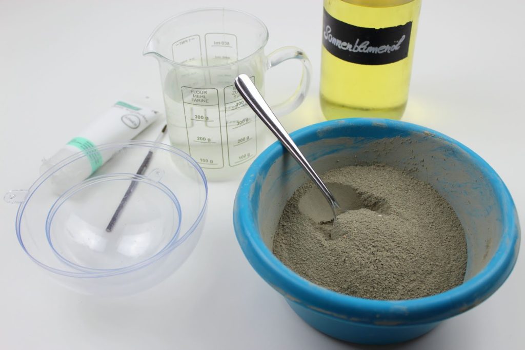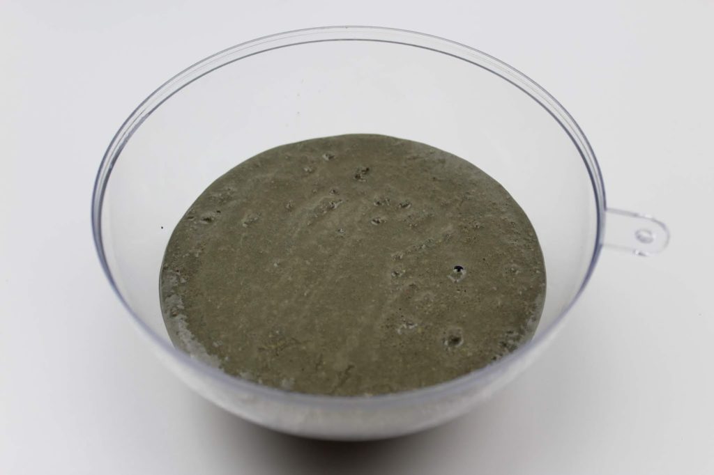 Füllt nun euren Beton in eine Schüssel. Gebt ein wenig Wasser zu dem Beton und rührt alles durch. Die Masse sollte eine Konsistenz wie auf dem Bild haben.