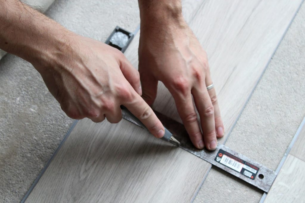 Das letzte Paneel wird dann auf die Länge angepasst. Nun gibt es mehrere Möglichkeiten, um die Vinylpaneele auf Länge zu bringen. Ihr könnt eine elektrische Stich- oder Kreissäge verwenden. Dann sollte das Dekor nach unten zeigen um Absplitterungen zu vermeiden. Dreht es dazu um 180° mit der Dekorseite nach oben. Zeichnet nun mit Hilfe eines Stiftes und eines Winkels die Länge an.
