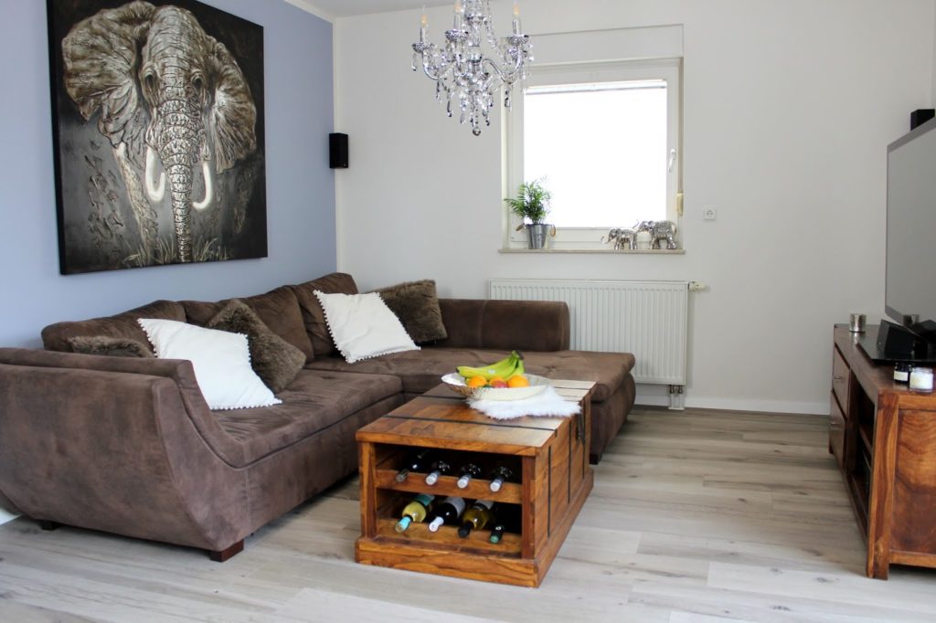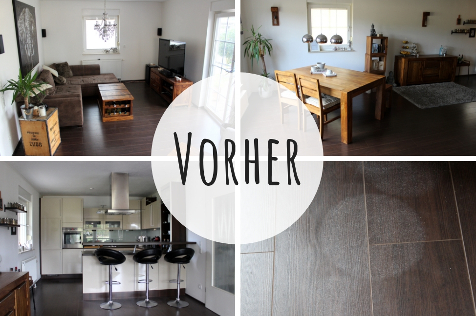 Ich bin vor 3 Jahren in mein neues zu Hause eingezogen. Seitdem steht auf meiner To Do Liste ein neuer Fußboden im Wohnzimmer. Der Fußboden ist noch von den Vorbesitzern und die haben schon über ihn geschimpft. Sie haben Laminat verlegt, das gar nicht mal so günstig war. Nach kurzer Zeit waren nicht nur überall Kratzer, sondern an allen Stellen, an denen etwas stand, bleichte der Boden einfach aus und es gab helle Flecken. Aber nun ist Schluss und der Fußboden muss weg. So sah mein Wohnzimmer vorher aus.