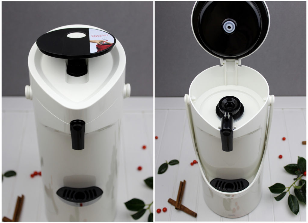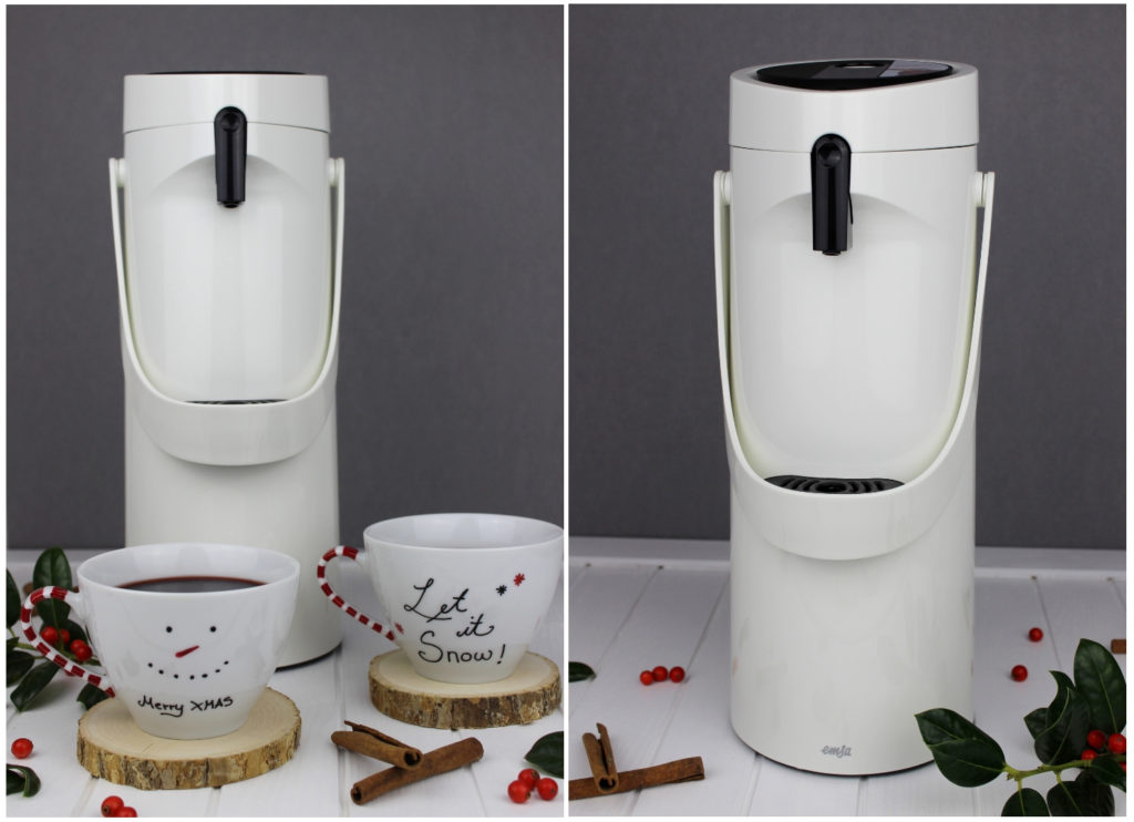 Und nun kommt EMSA ins Spiel. EMSA hat eine ganz tolle Pumpkanne auf den Markt gebracht, die PONZA Pumpkanne. Sie hält Getränke bis zu 12 Stunden heiß, aber auch bis zu 24 Stunden kalt. Also ideal für unseren selbstgemachten Glühwein.