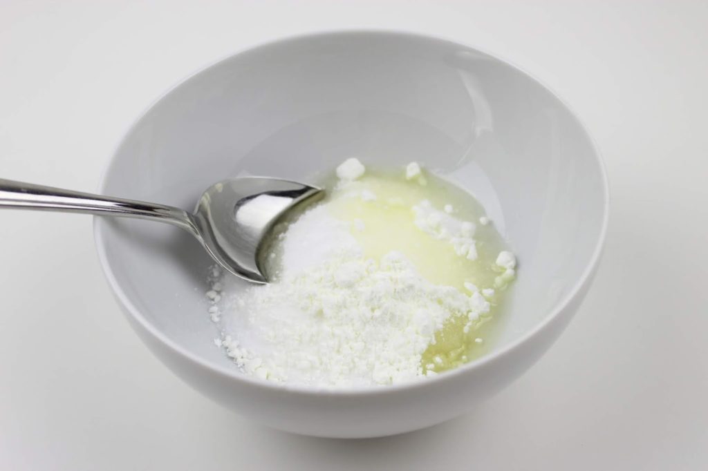 Gebt zuerst 100g Natron, 50g Zitronensäure, 50g Salz, 25g Speisestärke und 3 EL Mandelöl in eine Schüssel.