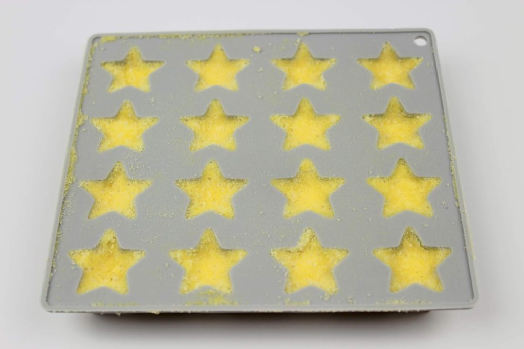 Füllt nun die Masse in die Sternenform. Dazu kann man gut einen Teelöffel verwenden.