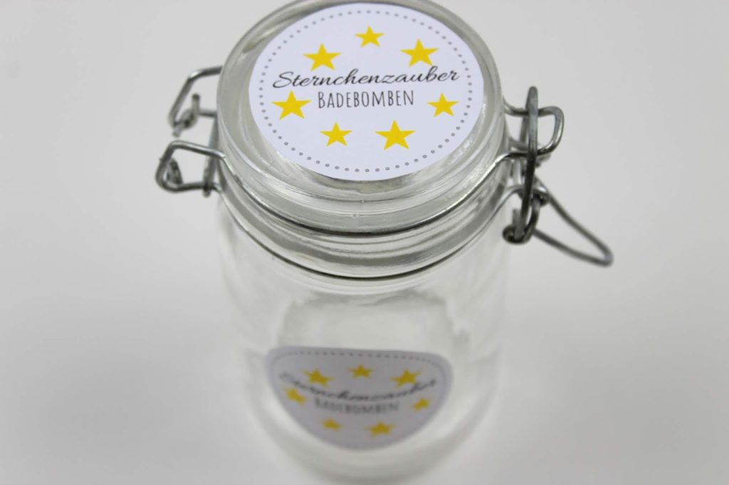 Befüllt nun euer Einmachglas mit den kleinen sternförmigen Badebomben. Und fertig ist eure kleine Geschenkidee zu Weihnachten.