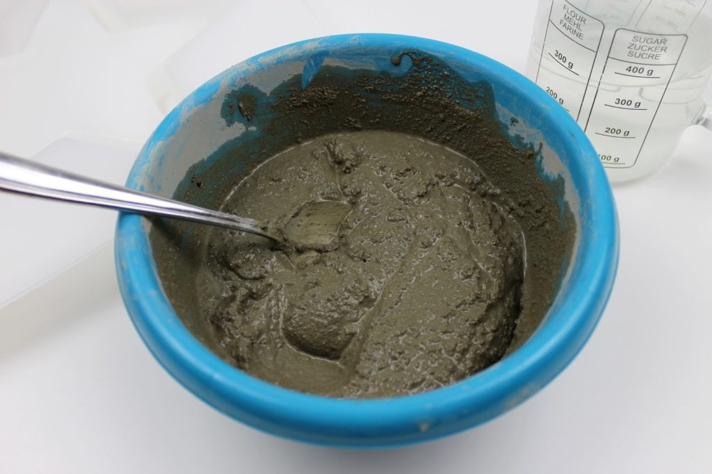 Mischt nun euren Beton an. Gebt dazu ein wenig Beton in eine Schüssel, gebt dann Wasser hinzu und rührt alles gut durch, bis eine gleichmäßige Masse entsteht.