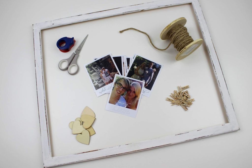 Legt eure Bilder erstmal lose in den Bilderrahmen, so wisst ihr wie viele Fotos ihr braucht und wo ihr später die Schnur befestigen müsst.