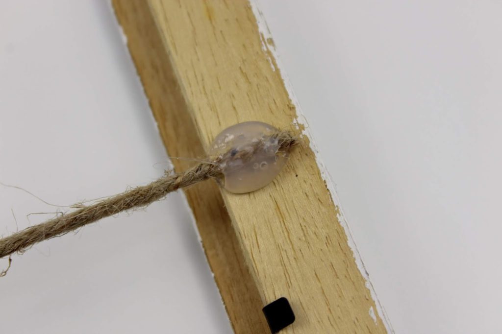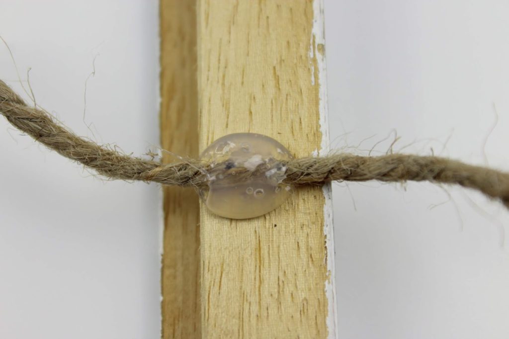 Wenn alles gut getrocknet ist, können wir mit der anderen Seite weitermachen. Macht dazu wieder einen Tropfen mit der Heißklebepistole auf den Bleistiftstrich. Jetzt könnt ihr problemlos an der Paketschnur ziehen und sie in den Kleber legen. Gebt auch hier wieder ein wenig Kleber auf die Paketschnur, so dass sie bedeckt ist. Nun müsst ihr die Schnur nur ein wenig festhalten, bis der Kleber getrocknet ist. Und tadaaaa die Schnur ist ganz straff gespannt.