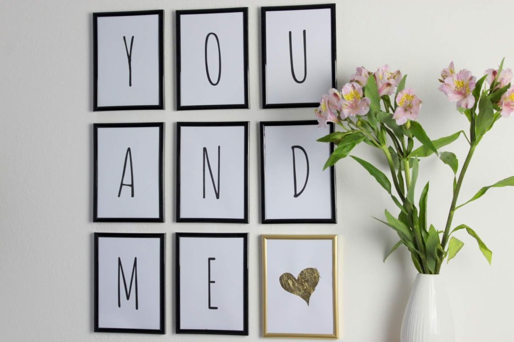 Steckt dann die Vorlagen in die Bilderrahmen und befestigt alles an einer Wand. In meinem Fall hat es gereicht, Nägel als Aufhängung in der Wand zu befestigen. Das hängt aber natürlich von der Beschaffenheit eurer Wand ab. Und schon ist die Wand fertig! Ich finde es total schön und es geht wirklich schnell.