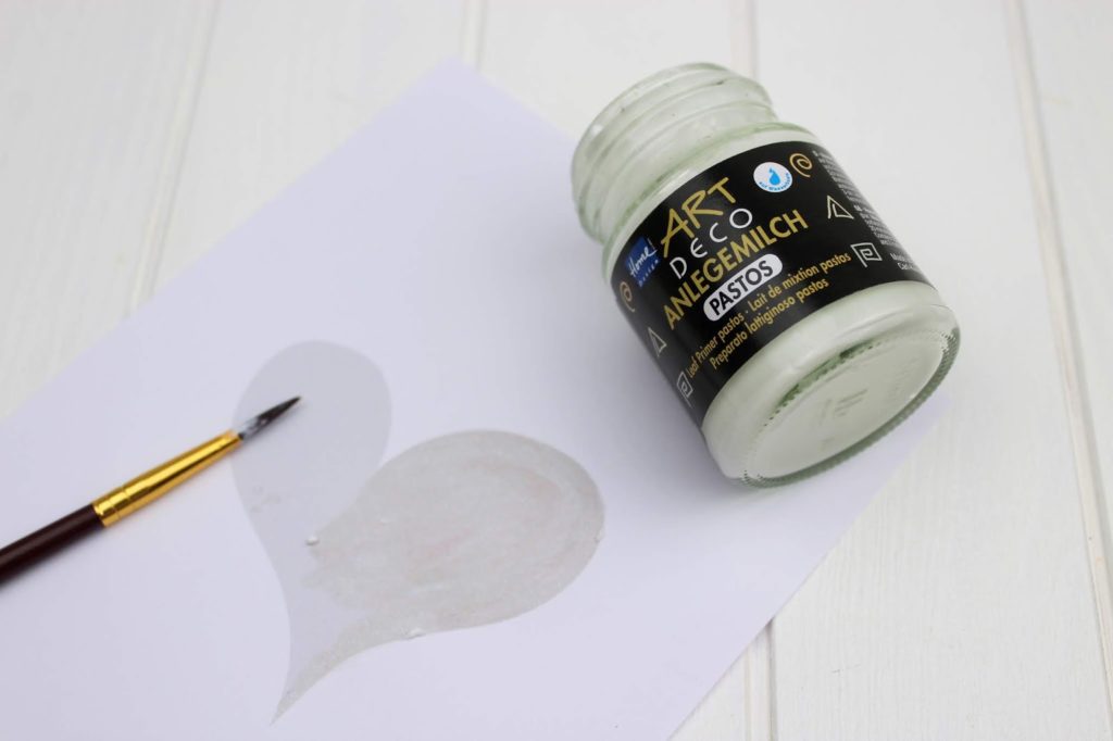 Wer sein Herz aus Blattgold machen möchte wie ich, pinselt die Herzvorlage mit Anlagemilch ein.