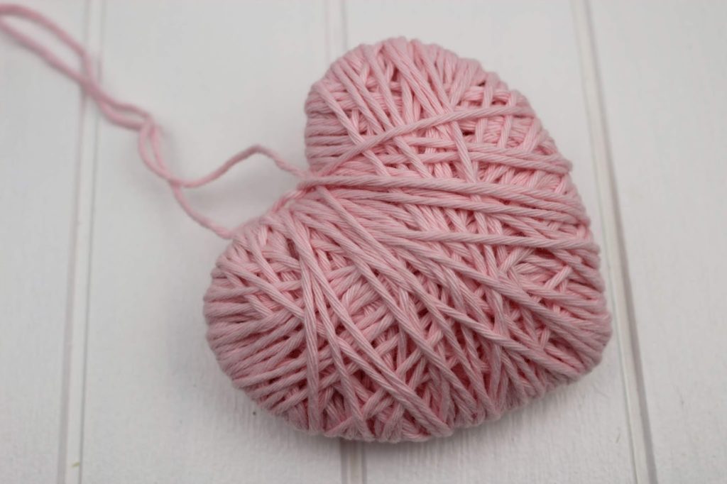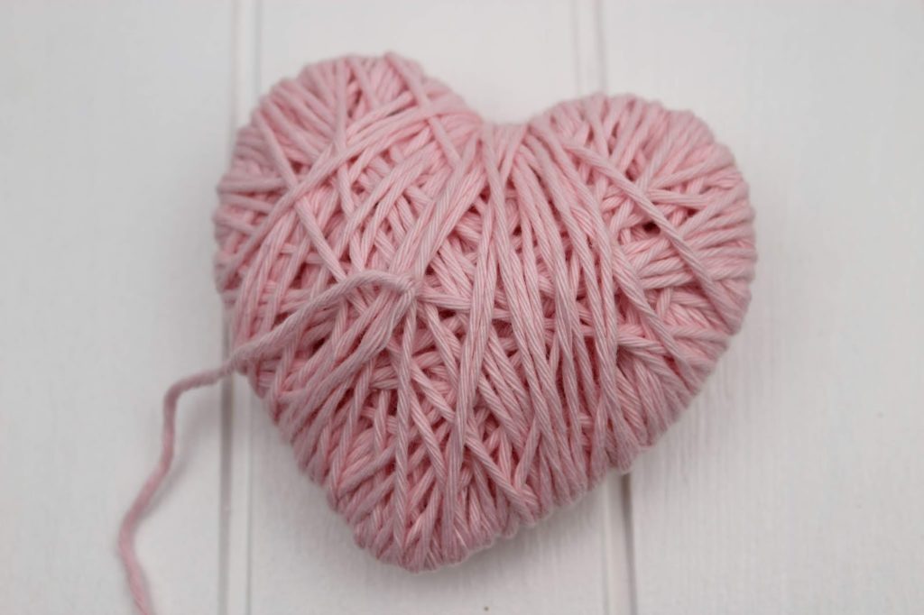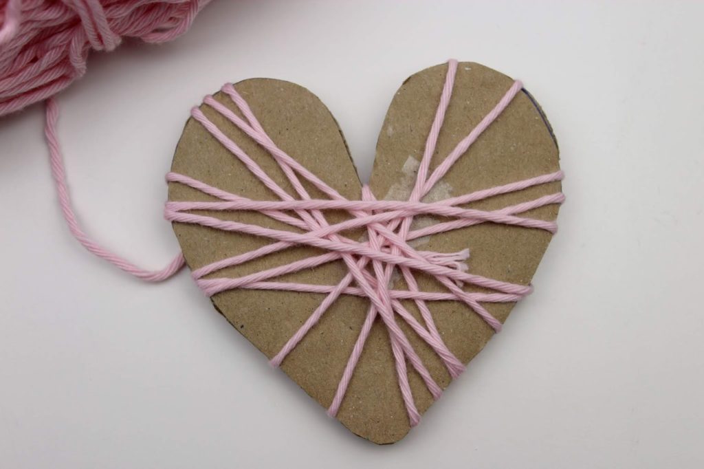 Wenn die Pappe nicht mehr zu sehen ist, verknotet euren Wollfaden auf einer Seite des Herzens. Macht am besten einen Doppelknoten, damit auch alles gut hält.
