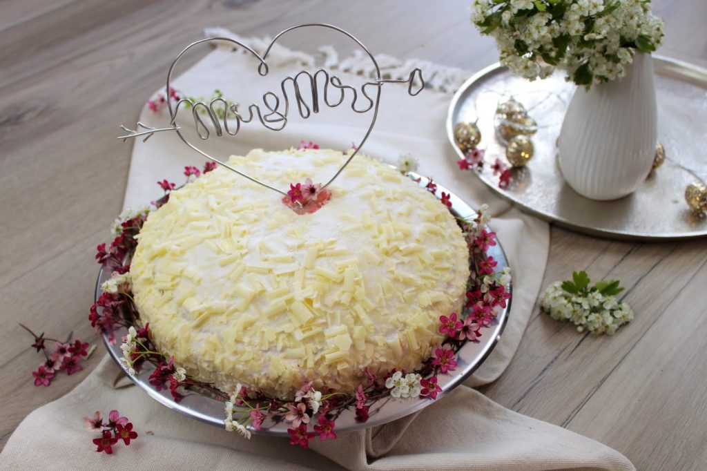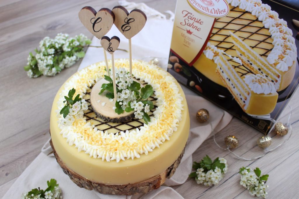 Super einfach oder? Nun nur noch auf die Feinste Sahne Marzipan Torte stellen und mit ein paar Blümchen dekorieren.
