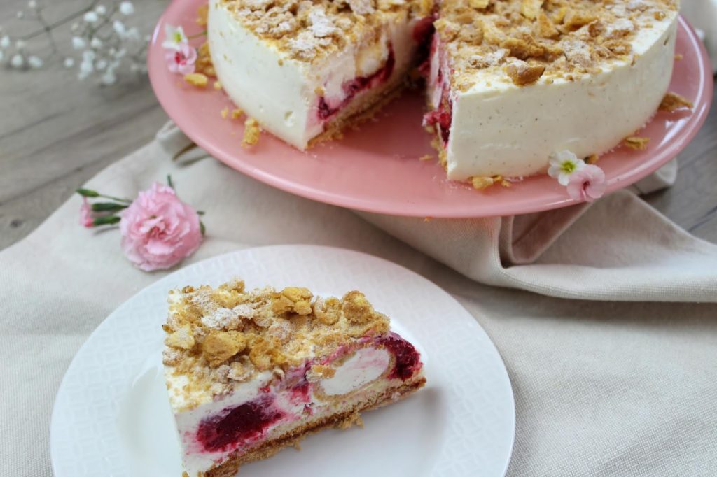 Die Erdbeer-Pannacotta-Kuppeltorte besticht mit ihrer cremigen Pannacotta-Sahne mit fruchtigen Erdbeeren und Erdbeermousse zwischen hellen Biskuitböden. Der Boden besteht aus einem krossem Mürbeteig.