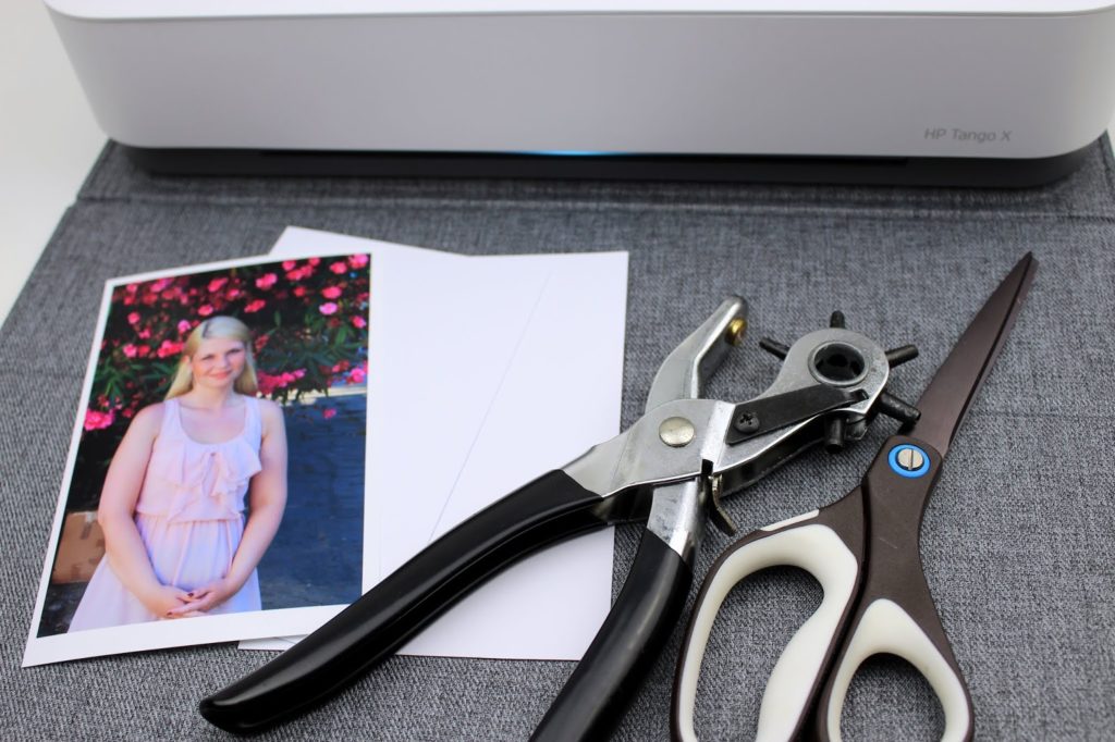 5. Macht oben links mit der Lochzange ein Loch in das Foto und auch in die beiden Bastelpapiere.