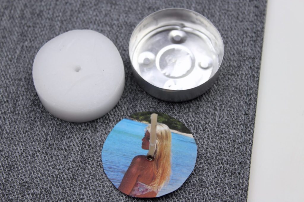 4. Baut euer Teelicht auseinander und fädelt euer Bild mit dem Loch auf den Docht. Danach steckt ihr alles wieder zusammen.