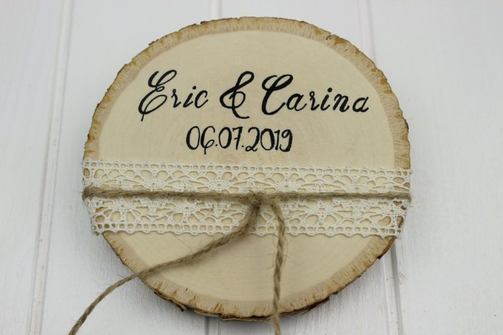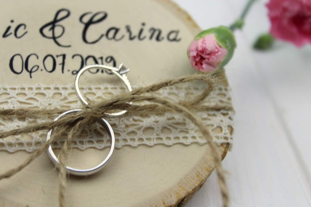 Befestigt dann eure Trauringe mit einer Schleife an der Holzscheibe.