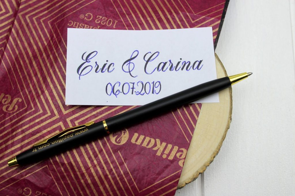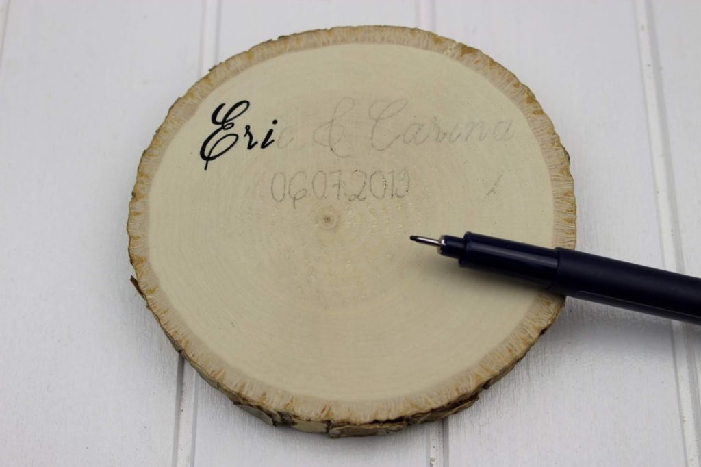 Druckt eure Namen oder die Namen des Brautpaares aus und paust diese mit Pauspapier auf eure Holzscheibe. Zum Durchpausen habe ich einen Kugelschreiber verwendet.