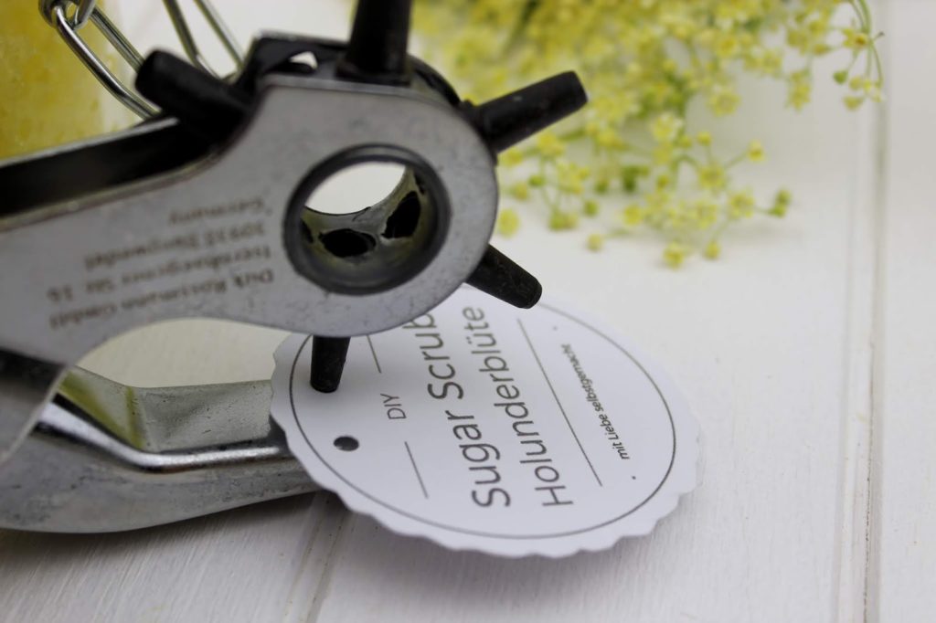 Macht dann mit einer Lochzange oder Schere 2 Löcher in das Etikett.
